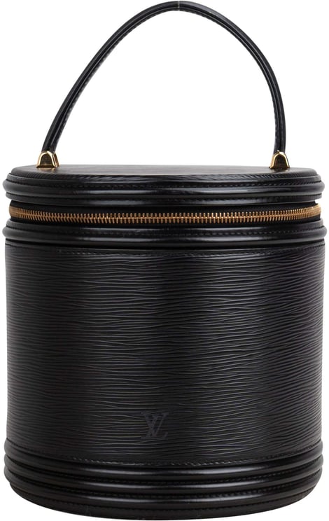 Een elegante Noir Epi Leather Cannes Vanity Handbag met cilindrisch, minimalistisch ontwerp en strakke lijnen die tijdloze verfijning uitstraalt. De diepzwarte Epi leren uitvoering heeft een subtiele glans en wordt bovenaan afgesloten met een ronde klep en gouden rits, wat een luxe accent toevoegt. De stevige, elegante handgreep en het discrete LV-logo benadrukken de exclusiviteit, terwijl de compacte afmetingen van 20 x 19 x 18 cm de tas functioneel en draagbaar maken. Bijgeleverd is een stofzak als accessoire.