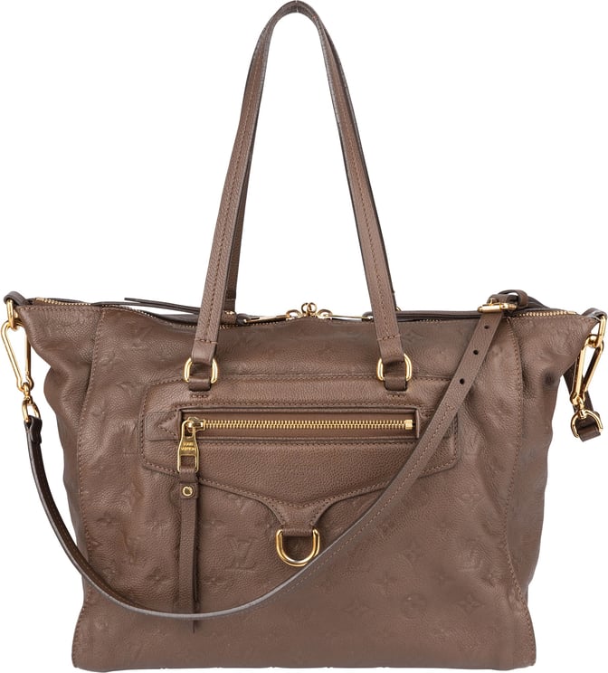 Een compacte schoudertas uit 2013 met monogram empreinte leer, afgewerkt met vlakke leren handvatten en een afneembare platte schouderband voor veelzijdig draagcomfort. De tas sluit met een rits bovenaan en beschikt zowel aan de buitenkant een frontritszak als een binnenzijde met een ritssluiting, afgewerkt met goudkleurige hardware. De tekstuur toont het iconische monogrampatroon en de afmetingen zijn 34,0 x 27,5 x 19,0 cm, vervaardigd in Frankrijk en uitgevoerd in blauw. Het ontwerp combineert strakke lijnen met praktische vakindeling en een luxe uitstraling.