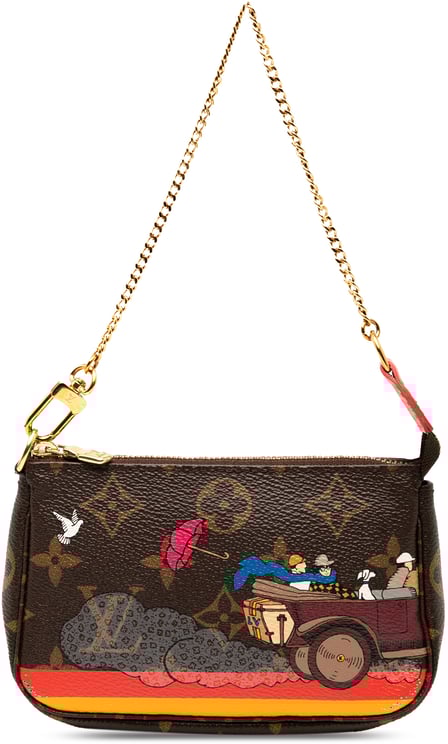 Een compacte Monogram Evasion Illustre Mini Pochette Accessories met het iconische monogramcanvas en een kleurrijke, cartoonachtige illustratie van figuren in een vintage auto, die het bruine oppervlak levendig maakt. Het model heeft een gouden kettinghengsel en sluit met een ritssluiting aan de bovenzijde, terwijl de afmetingen 14 x 10 x 2 cm zijn en het stuk in 2015 in Frankrijk is vervaardigd. Dit accesoire combineert kunstzinnige details met draagbaarheid en een opvallende, elegante kettingconstructie.