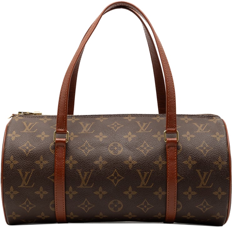 Een compacte, cilindervormige Monogram Papillon 26 met het kenmerkende monogramcanvas en leren afwerking, uitgevoerd in bruin en vervaardigd in Frankrijk in 1996. De tas heeft platte leren handvatten, een bovenrits en een subtiel gouden ogende ritsdetail; de afmetingen zijn 26 x 13 x 13 cm. Het harmonieuze all-over logo vormt samen met de contrasterende lichtbruine handvatten een tijdloze, herkenbare uitstraling die zowel functionaliteit als raffinement uitstraalt.
