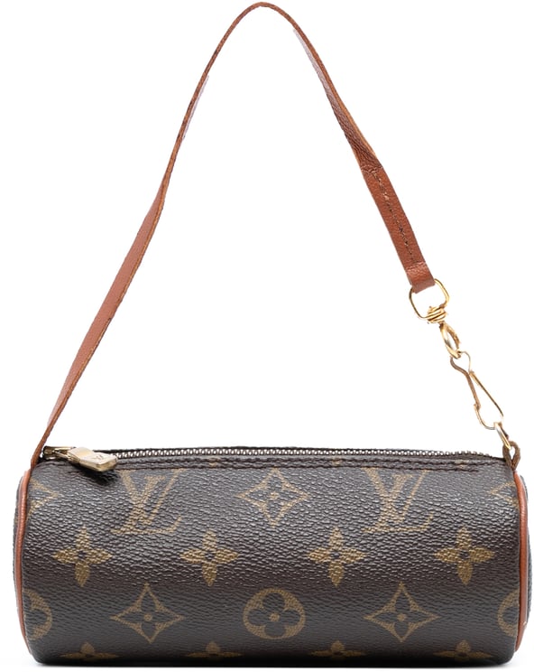 Een slanke, cilindrische Monogram Papillon Pochette met monogram canvas en leren biezen, uitgevoerd in bruin en vervaardigd in Spanje. De tas heeft een afneembare platte leren schouderband, een bovenritssluiting met goudkleurige details en een minimalistische afwerking die het symmetrische logo benadrukt. Afmetingen: 15,50 x 6,00 x 6,00 cm. Fabricaatjaar 2000–2025; de staat is beoordeeld als AB met zichtbare gebruikssporen zoals gekreukte buiten- en binnenhandgreep, krassen aan bevestiging en beschadigde zijkant, en een gerafelde/verkleurde rits.