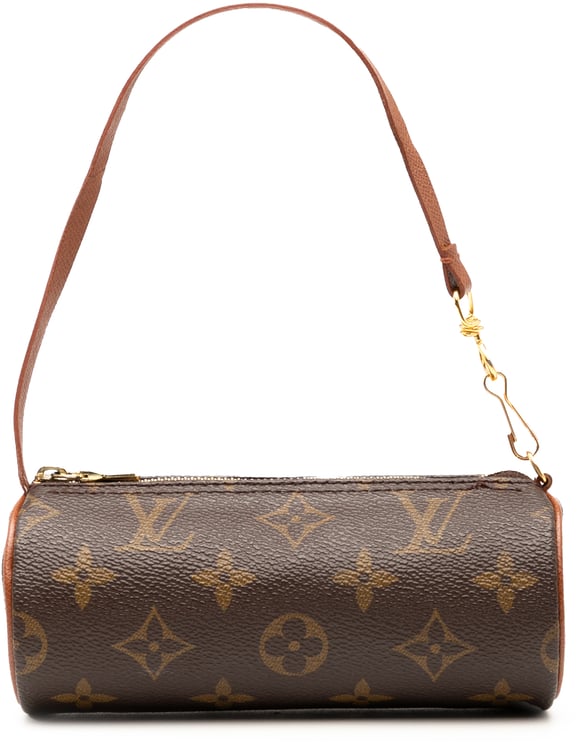 Een compacte Monogram Papillon Pochette met het herkenbare monogram in bruin, cilindrische vorm en een toprits die functionaliteit en elegantie combineert. Het ontwerp heeft gouden hardware en een platte leren schouderband die subtiel contrasteert met het canvas, waarbij zorgvuldig afgewerkte naden en het logo op de rits het vakmanschap benadrukken. Afmetingen: 15,5 x 6 x 6 cm. Gemaakt in Frankrijk; jaartal van productie vermeld als 1990–2025.
