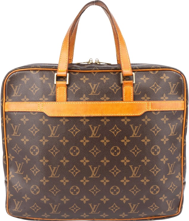 Een elegante Porte-Documents Pegase uitgevoerd in het iconische monogrampatroon met gouden hardware en platte leren hengsels, vervaardigd in Frankrijk in 2003. De tas heeft een ritssluiting bovenaan, een binnenvak met rits plus steek- en open vakken en een opgestikte voorvak dat praktische opbergruimte biedt. Afmetingen: 32,00 x 36,00 x 7,50 cm, uitgevoerd in bruin met contrasterende lichtere handvatten voor een subtiel accent. Het gestructureerde ontwerp combineert klassieke Louis Vuitton‑elementen met een moderne, zakelijke uitstraling.