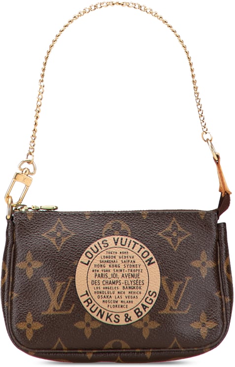 Kleine Monogram Trunks and Bags Mini Pochette Accessoires uit 2007 met het iconische monogramcanvas en een trunks & bags print, afgewerkt met een ronde metalen schijf met tekst “LOUIS VUITTON TRUNKS & BAGS” en een goudkleurige ketting als hengsel. De mini pochette sluit met een toprits en heeft afgeronde vormen met subtiele stiksels die het ontwerp een verfijnde, tijdloze uitstraling geven. Afmetingen: 14,50 x 9,50 x 3,50 cm; vervaardigd in Frankrijk. Materiaal: monogramcanvas. Dit high-end damesaccessoire combineert vintage accenten met een luxe afwerking.