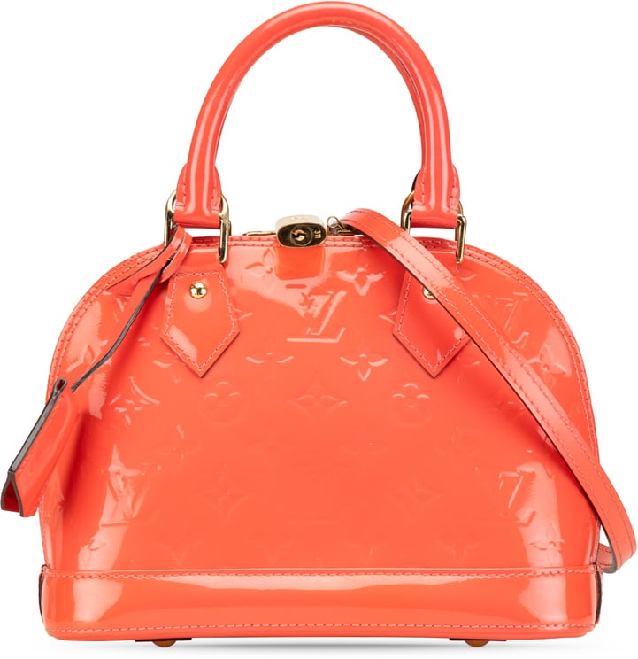 Deze Monogram Vernis Alma BB combineert een glanzend vernisleren oppervlak met de herkenbare, elegante Alma-vorm en subtiel geperst Louis Vuitton-monogram, uitgevoerd in rood en vervaardigd in Frankrijk in 2013. Het model heeft ronde, gevulde handvatten, een afneembare platte schouderriem, een clochette en een rits rondom met een binnenvak voor organisatie; de afmetingen zijn 24,00 x 17,00 x 11,50 cm. Gouden hardware en een gestructureerde bodem met metalen voetjes geven extra luxe en functionaliteit, en een certificaat van echtheid kan op verzoek worden verstrekt.