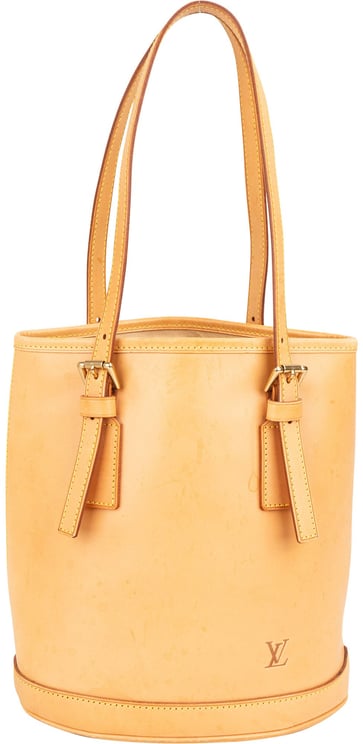 De Nomade Petit Bucket combineert een minimalistische, tijdloze vorm met praktische functionaliteit dankzij verstelbare platte lederen schouderbanden en een open bovenkant met binnenrits- en steekvakken plus een bijgeleverde pouch. Het model heeft een leren buitenzijde in bruin en is afgewerkt met metalen noppen onderop en subtiel geplaatst Louis Vuitton-logo; vervaardigd in Frankrijk in 2001. Afmetingen: 27 x 23 x 17 cm. De sluiting is open en de ritssluiting in het interieur is aanwezig, de constructie omvat een praktische bevestiging en leren handvatten.