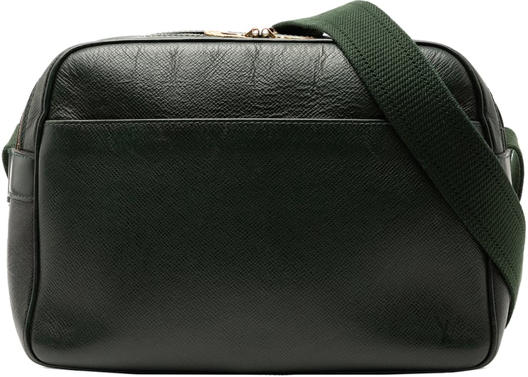 De Taiga Reporter PM combineert een minimalistische, vierkante vorm met een rijke donkergroene taiga-leer afwerking en een brede, verstelbare schouderband voor comfortabel dragen. Het ontwerp heeft dubbele bovenritsen, een goudkleurige ritsaccent en zowel een buiten- als binnenvak voor overzichtelijke indeling; afmetingen 26 x 20 x 13 cm. Dit model is gemaakt in Frankrijk en stamt uit 2003, waarbij het discrete Louis Vuitton-logo de verfijnde uitstraling onderstreept.