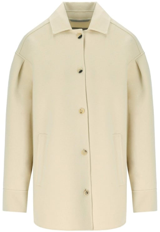 Een elegant Ivory jacket uit de Emblema-collectie met een klassieke overhemdkraag en een frontsluiting met tone-on-tone knopen en hoorn-effect details. Het jasje is uitgevoerd in katoenmix jersey en heeft lange mouwen met licht geplooide schouderpartij en knoopmanchetten, plus twee verticale paspelzakken vooraan. De achterkant heeft een rugpand met inzetsels en plooien die subtiele volume creëren; de randen zijn tone-on-tone afgewerkt. Het jasje is ongevoerd en uitgevoerd in een zachte crèmekleur die tijdloze elegantie uitstraalt.