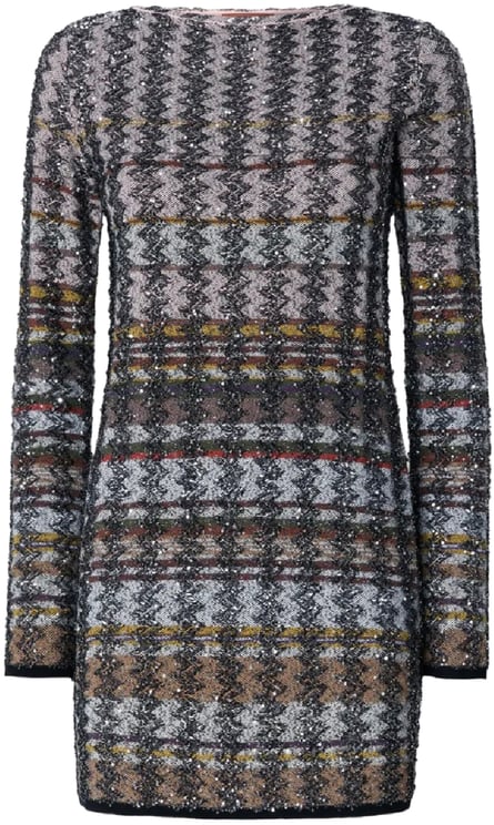 Deze mini jurk uit de Dresses Pink-lijn valt op door het kenmerkende zigzagpatroon in een harmonieuze mix van grijs, zwart, bruin en subtiele roodaccenten, gecombineerd tot een dynamisch geometrisch ontwerp. Lange mouwen en een ronde halslijn geven de jurk een elegante uitstraling, terwijl glinsterende details een luxueuze toets toevoegen. De verfijnde afwerking met een contrasterende rand aan de onderzijde benadrukt de speelse stijl en zorgt voor een verzorgd silhouet. Een opvallend statement voor wie kiest voor een modieuze, artistieke look.