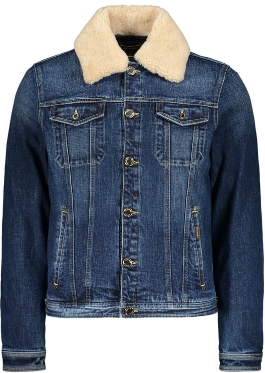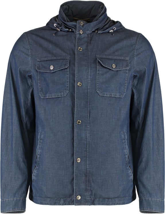 Deze denim jas uit de Moorer high-end collectie combineert een diepe blauwe tint met een modern, door details benadrukt ontwerp. De jas heeft een opstaande kraag, een tweewegrits onder een geknoopte klep en grote logoknopen, aangevuld met contraststiksels die de lijnen accentueren. Functioneel is de indeling duidelijk: drie klepzakken voorop en een extra ritssluiting in één zak, aangevuld met epauletten op de schouders voor een militaire touch. Lederen details en de materiaalmix van 65% polyester/35% katoen, 67% katoen/33% polyamide en 100% runderleer onderstrepen de hoogwaardige afwerking.