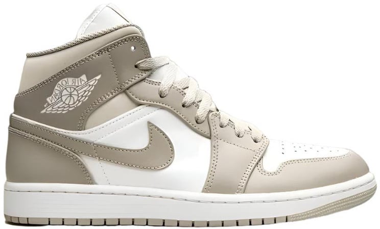 De Air Jordan 1 Mid Light Smoke Grey Anthracite sneakers van Nike bieden een opvallend ontwerp met een combinatie van wit, grijs en zwart. De bovenkant is modern en strak, met een gestileerde zwarte Swoosh die contrasteert met de lichte achtergrond. De hiel is afgewerkt met een zwart leren paneel en het iconische Air Jordan-logo, wat een sportieve flair toevoegt. Perforaties op de neus zorgen voor ventilatie. Subtiele stiksels en een gestikte zool benadrukken de aandacht voor detail, waardoor deze sneakers zowel tijdloos als trendy zijn.