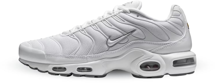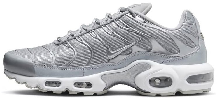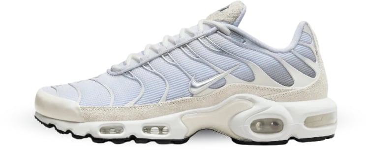 De Air Max Plus Pure Platinum combineert een strak, modern silhouet met een overwegend witte basis en glanzende zilveren accenten aan de zijkanten die voor dynamisch contrast zorgen. Golvende lijnen op de bovenkant geven een sportieve flair en subtiele textuurvariaties creëren diepte en complexiteit in het ontwerp. Het iconische Nike-logo verschijnt in een metallic tint en de zichtbare luchtkussens in de rubberen zool benadrukken zowel stijl als demping. De rubberen buitenzool in zwart zorgt voor een gedurfde afwerking die het geheel afmaakt.