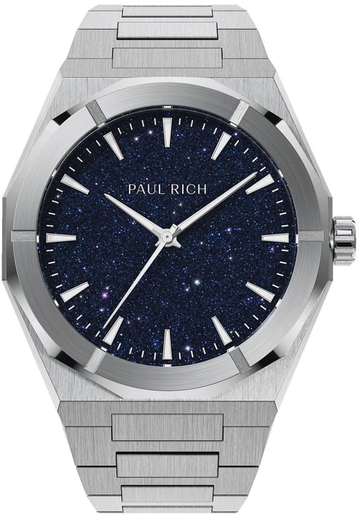 Het Paul Rich Star Dust II Black SD201 horloge is een premium accessoire voor heren met een opvallend ontwerp. De 43 mm grote horlogekast is gemaakt van mat geborsteld staal en beschikt over een unieke aventurijn blauwe wijzerplaat, die doet denken aan een sterrenhemel. De slanke zilverkleurige indexen en wijzers zorgen voor een modern uiterlijk. Dit horloge is uitgerust met een betrouwbaar Citizen Miyota uurwerk en is waterdicht tot 5 ATM, waardoor het geschikt is voor dagelijks gebruik. Een elegant sieraad dat elke outfit aanvult.