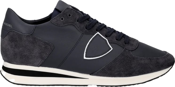 De Philippe Model trpx mondial nubuk bleu sneakers voor heren combineren verschillende kleuren en stijlen tot een modern ontwerp. Het bovenwerk is vervaardigd uit leer en katoen, met een rubberen zool voor duurzaamheid en comfort. De sneakers zijn uitgevoerd in een mix van grijs en blauw, met een subtiele glans. Een iconische schildvormige applicatie aan de zijkant en contrasterende witte en zwarte accenten langs de zool zorgen voor een sportieve uitstraling. De diverse texturen en het dynamische lijnenspel maken deze sneakers een opvallend element in elke outfit.