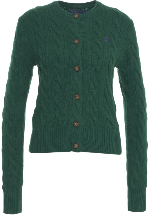 Een luxueuze cardigan uit de Polo Ralph Lauren-lijn met een klassiek kabelbreipatroon dat veel textuur en diepte biedt. De rijke donkergroene kleur krijgt extra contrast door de warme, bruine knopen aan de voorzijde. De ronde halslijn en lange mouwen geven tijdloze elegantie, terwijl geribde boorden bij polsen en onderkant voor een aansluitende pasvorm zorgen. Een klein geborduurd Ralph Lauren-logo op de borst voegt een subtiele, herkenbare finishing touch toe.