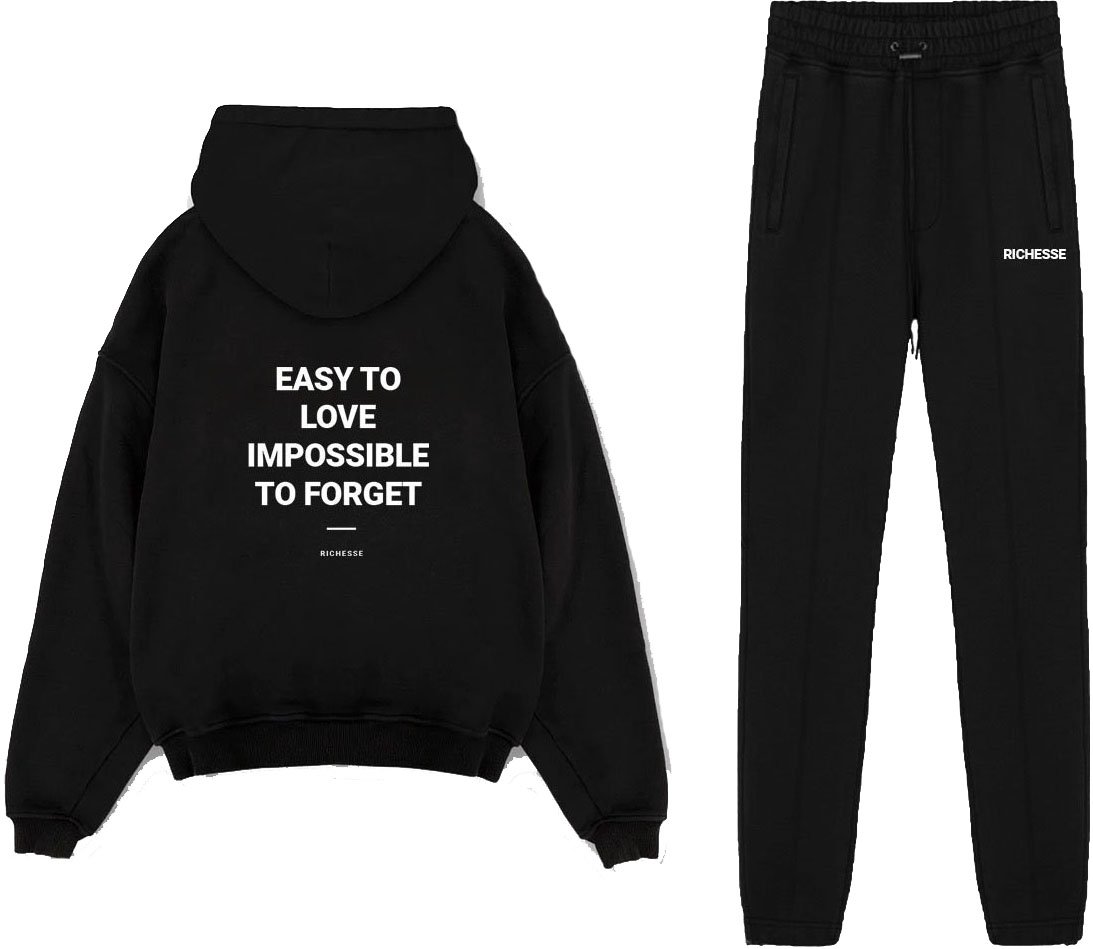 De UNFORGETTABLE SET van Richesse is een premium tracksuit voor heren, uitgevoerd in een tijdloze zwarte kleur. De hoodie heeft een licht oversized pasvorm en is voorzien van een opvallende tekst op de achterkant: "EASY TO LOVE IMPOSSIBLE TO FORGET" in grote, witte letters. De joggingsbroek sluit ideaal aan en draagt bij aan het stijlvolle geheel. Gemaakt van 100% hoogwaardig katoen met een GSM van 220, biedt deze set zowel comfort als een eigentijdse uitstraling. De subtiele branding met het logo van Richesse voegt een minimalistisch accent toe.