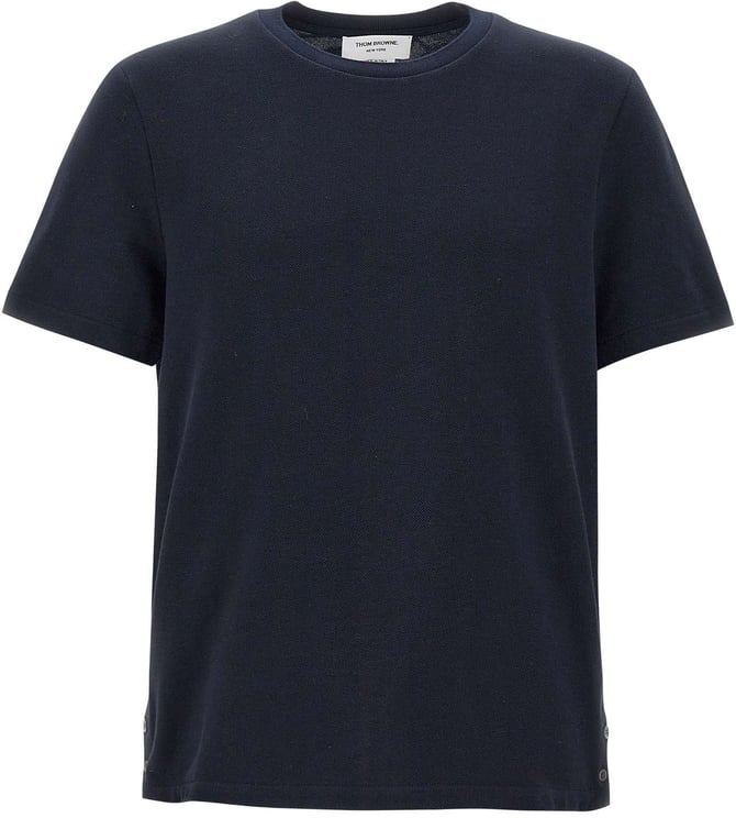 Dit Piqué cotton t-shirt uit de Thom Browne-collectie combineert een tijdloze marineblauwe piqué met verfijnde details voor een elegante uitstraling. De ribgebreide halslijn en zijsplitten met knoopsluiting benadrukken zowel draagcomfort als afwerking, terwijl de kenmerkende tricolor streep aan de onderzijde het ontwerp direct herkenbaar maakt. Subtiele branding verschijnt op een klein label aan de onderkant, wat de luxe van het merk onderstreept. Gemaakt van 100% katoen.