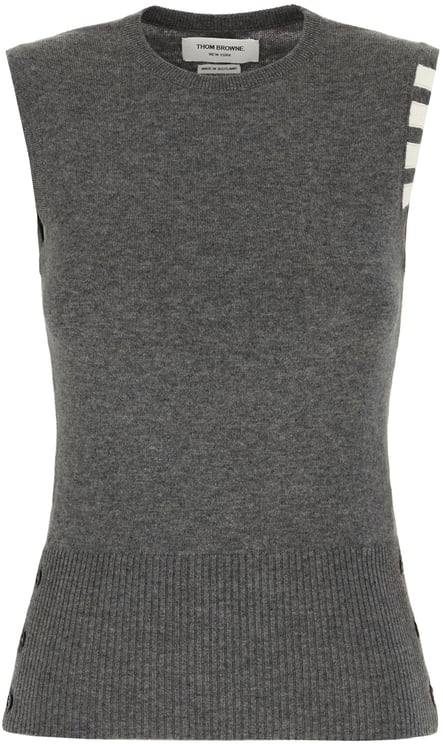 De Thom Browne Graphite cashmere sleeveless sweater is vervaardigd uit hoogwaardige cashmere en biedt een elegante, donkere grijstint voor een tijdloze uitstraling. Dit damesmodel heeft een moderne, mouwloze snit met een ronde halslijn die zorgt voor een verfijnde look. Het ontwerp is verrijkt met een kenmerkende streep in wit en zwart op de schouder, wat een unieke twist aan het minimalistische geheel geeft. De ribgebreide onderzijde voegt subtiele textuur toe, terwijl knoopdetails aan de zijkanten een functioneel en visueel accent bieden.