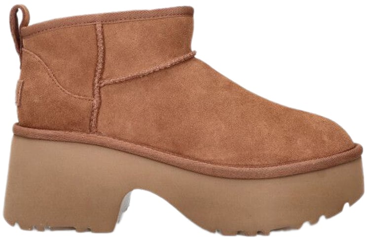 De Classic Ultra Mini New Heights Boots van UGG zijn ontworpen voor dames en bieden een moderne uitstraling met een chunky zool. De warme, bruin aardetint maakt ze veelzijdig en geschikt voor verschillende outfits. De korte schacht heeft een strakke, minimalistische lijn, wat zorgt voor een eigentijdse look. Subtiele stiksels langs de naden voegen een verfijnd detail toe. De handige lip aan de achterzijde vergemakkelijkt het aan- en uittrekken. Deze boots combineren een robuuste zool met een elegante schacht voor een trendy statement.