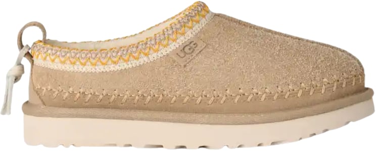 De Tasman Biarritz slipper in light beige combineert een soepel suède bovenwerk met een handgestikte, gevlochten rand in contrasterend geel en wit garen die de kraag textuur en karakter geeft. Een gedebosseerd UGG-logo en robuuste kruissteekafwerking op de wreef benadrukken ambachtelijke details, terwijl de handige lus achteraan functionaliteit toevoegt. De lichte, stevige zool en het comfortabele ontwerp maken deze instapper geschikt voor langdurig dragen en geven een casual chic uitstraling. Dit model straalt verfijnde eenvoud uit en is veelzijdig te combineren.