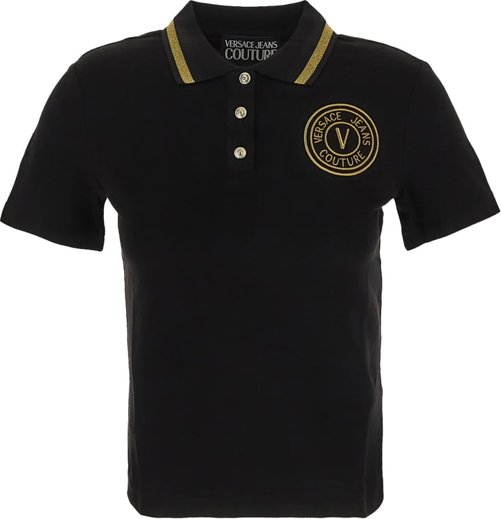 Deze polo van Versace Jeans Couture biedt een elegante zwarte basis met een tijdloze uitstraling. De kraag en mouwranden zijn afgewerkt met een opvallende gouden bies, wat een luxe accent toevoegt. Een groot, rond logo in een contrasterende kleur is geborduurd op de borst, wat het merk benadrukt. De knoopsluiting bestaat uit drie stijlvolle, glanzende knopen. Dit klassieke ontwerp met moderne details maakt de polo geschikt voor zowel casual als formele gelegenheden, ideaal voor het lent- en zomerseizoen.
