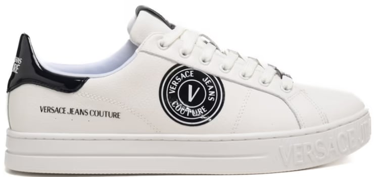 Sneaker Court 88 V-Emblem by Versace Jeans Couture made of white grained leather with logo on the side and heel. Fabric lining and faux leather insole. White rubber sole, height 3 cm.