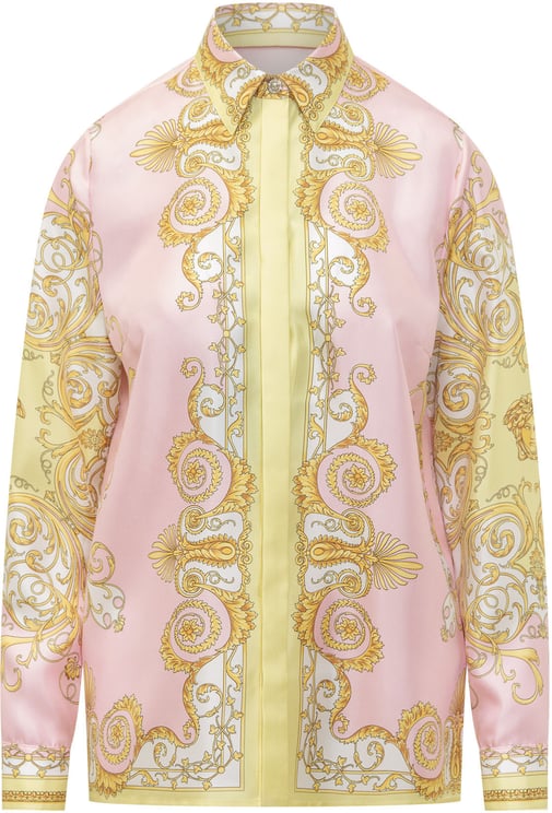 De DRESS BAROCCO van Versace is een opvallende jurk met een verfijnde mix van kleuren en stijlen, ideaal voor het herfst- en winterseizoen. De basis in een zachte crème tint is versierd met een levendig patroon van zeedieren, schelpen en barokke elementen in goud, blauw en roze. Deze jurk heeft een klassieke kraag en knoopsluiting, wat bijdraagt aan de elegante uitstraling. De strikceintuur accentueert de taille en de subtiele decoratieve lijnen langs de zijkanten brengen extra aandacht naar het ontwerp.
