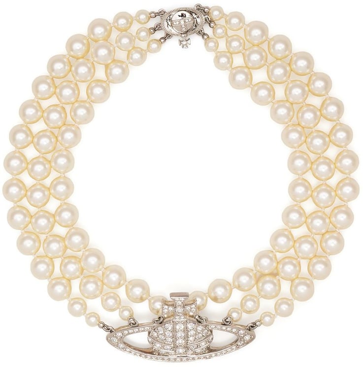 Een elegante ketting met drievoudige rij glanzende imitatieparels die soepel om de hals vallen, uitgevoerd in Platinumcreamrosewhite uitvoering. Centraal prijkt het kenmerkende Orb‑pendant in zilverkleurige afwerking met kroonvormige details en kristalversiering die contrasteren met de zachte pareltinten. Het ontwerp combineert klassieke parels met een gedurfde, gedetailleerde hanger en straalt tijdloze charme uit. Dit high-end accessoire van Vivienne Westwood is geschikt voor zowel formele als casual gelegenheden.