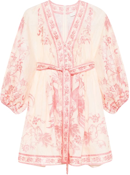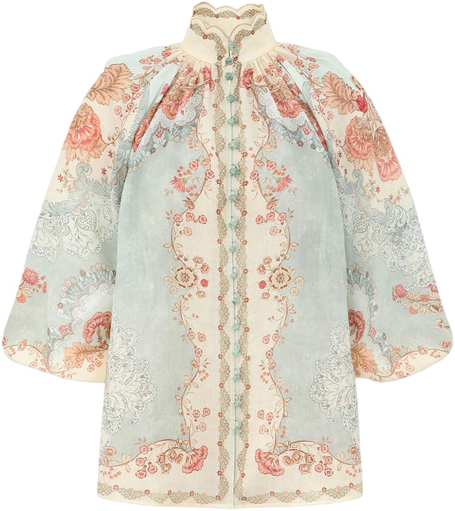 Deze Zimmermann Shirts Clear Blue blouse combineert een verfijnde high neck met lange raglanmouwen en elastische manchetten voor een elegante silhouet. Het ramie blend voelt licht en ondersteunt het all-over acacia print en het bloemmotief met gedetailleerde borduursels in zachte pastelkleuren, waaronder zachtblauw en crèmekleurig. De curved hem en subtiele plooien bij de schouders geven vorm en beweging, terwijl de front button fastening met opvallende knopen als onderscheidend detail fungeert. De lange, uitlopende mouwen en vintageachtige esthetiek zorgen voor een vrouwelijke, romantische uitstraling.