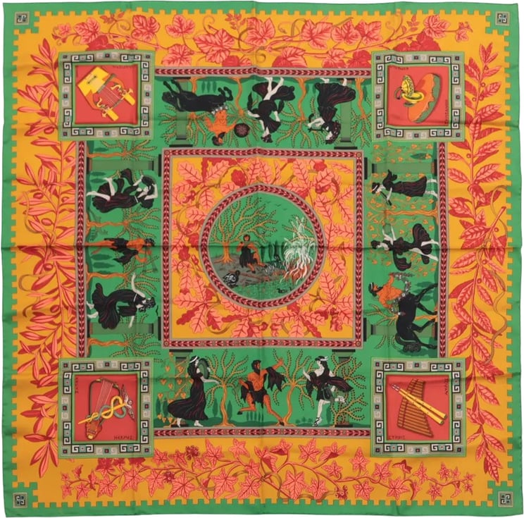 PRE-LOVED FINAL SALE WINTER SALE BEST SELLER Hermès Hermès Hermès Carré 90 "MUSIQUE DES DIEUX" Silk handkerchief in Orange x Green Vanaf € 232,- Origineel: Vanaf € 250,-