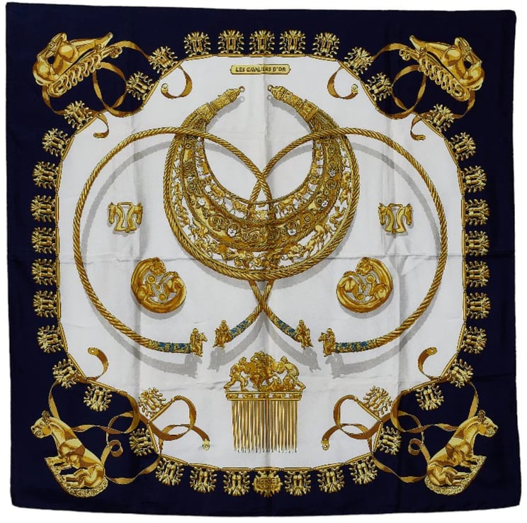 PRE-LOVED FINAL SALE WINTER SALE BEST SELLER Hermès Hermès Hermès Carré 90 "LES CAVALIERS D'OR" Silk handkerchief in Navy Blue Vanaf € 330,- Origineel: Vanaf € 350,-